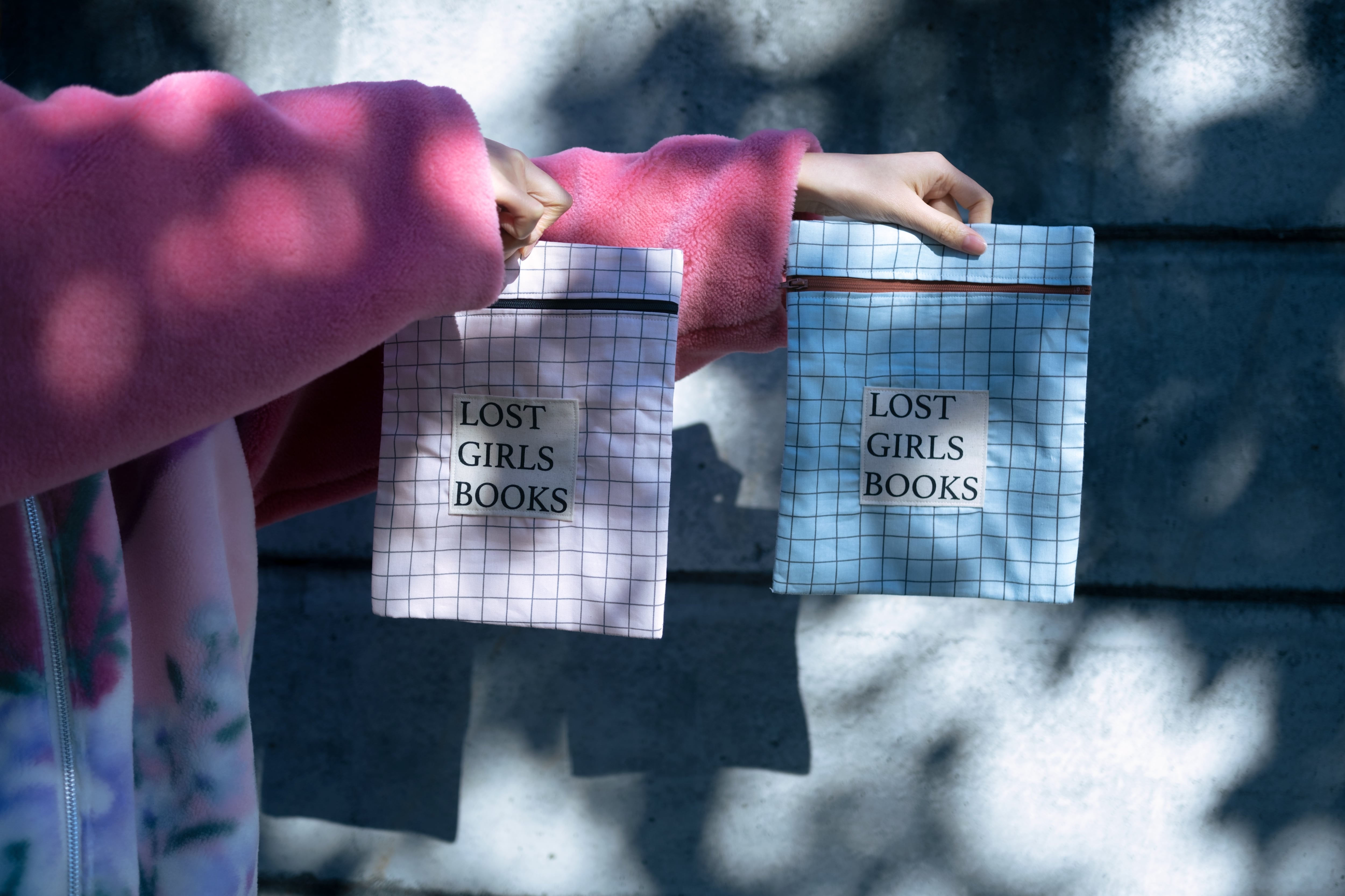 色彩、記憶、物語をテーマにものづくりの活動をする「NINE STORIES」によるブックポーチ。ピンクとブルーの2色の格子柄に、それぞれ異なる色のバイカラーのファスナーが。裏面には、愛にまつわるメッセージがハートのなかにハンドプリントされています。やわらかな心を守ってくれるお気に入りの本をたずさえて、どこまでもいけるように。